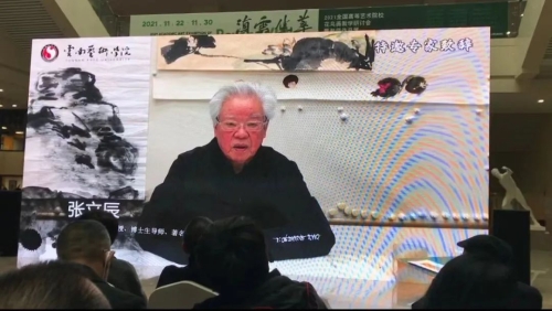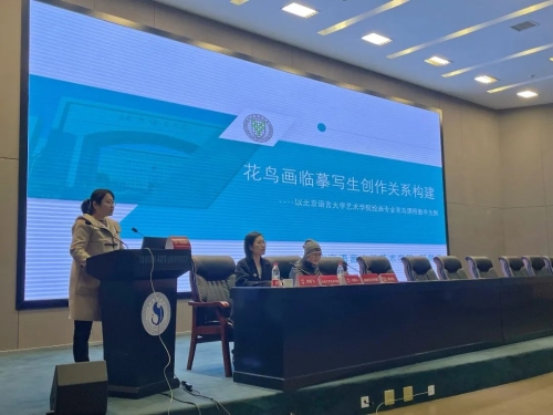 邬树乙老师在研讨会上以花鸟画临摹写生创作关系构建为题,介绍艺术学院绘画专业教学理念和专业特色优势,例如花鸟课程十分重视临摹,从对临开始练习,不鼓励学生拓临、罩临,主张背临和拟临,直至“参以己意”的变临,辅以写生带动创作,坚持践行以书入画,在学生的绘画习作和创作中初有成效;从多方面展示教学步骤中临摹、写生及创作如何环环相扣;尤其是绘画专业特有的教学环节——“名师进课堂”,不同于一般讲座形式,学院邀请国内知名大家走入课堂为学生现场进行教学示范,邬老师代表学院诚挚邀请与会的兄弟院校专家学者来北语“进课堂”;绘画专业自2019年开始新一轮教学改革,虽然没有将花鸟作为独立学科设置,但是在三年级下学期开始,设置了人物、花鸟、山水不同方向的专选课,辅助学生在明确的学科方向之路进行更加深入的专业研究创作,如何在有限的花鸟教学课程中解决更多的问题,也将在今后的绘画专业教学实践中不断探索和完善。