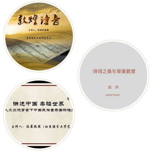 杨赛教授从先秦诗词、两汉魏晋南北朝诗词至金元明清诗歌进行了梳理讲解,教授《魏氏乐谱》《碎金词谱》等古谱记谱的演唱,原汁原味还原了中国古谱艺术之美。刘桂珍教授结合敦煌壁画诗乐为大家深度解析了丝绸之路音乐的辉煌。赵洪教授从美育视角阐释了诗词演唱与审美教育在提升大学生综合素质中发挥的重要育人功能。陈霞教授结合北语艺术国际传播的实践,从多元文化、文化自信、文化认同等角度阐释了中国民族音乐国际推广与传播的文化功能与意义,对中国民族音乐在日本、美国、意大利等国的推广历史进行了梳理,并对新时代中国民族音乐国际推广与传播的对策提出了展望与思考。讲座内容丰富生动,学术视野开阔,受到学员的高度赞誉。