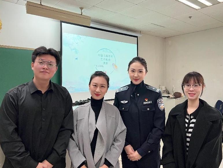 2022年11月2日,艺术学院2020级音乐国际教育与传播专业师生在中国人民公安大学《中国古典诗词艺术歌曲赏析》课堂顺利开展教学实践实习交流活动。中国人民公安大学团委艺术教研室王瑶任、北京语言大学艺术学院音乐专业刘小溪老师、2020级音乐专业张振伟和曹鑫垚同学参加了此次实践实习交流活动。在此次活动中,张振伟、曹鑫垚同学分别向公安大学的同学们分享介绍了中国传统乐器:笙和竹笛,并进行了现场演奏,赢得了公安大学同学们的一致好评。