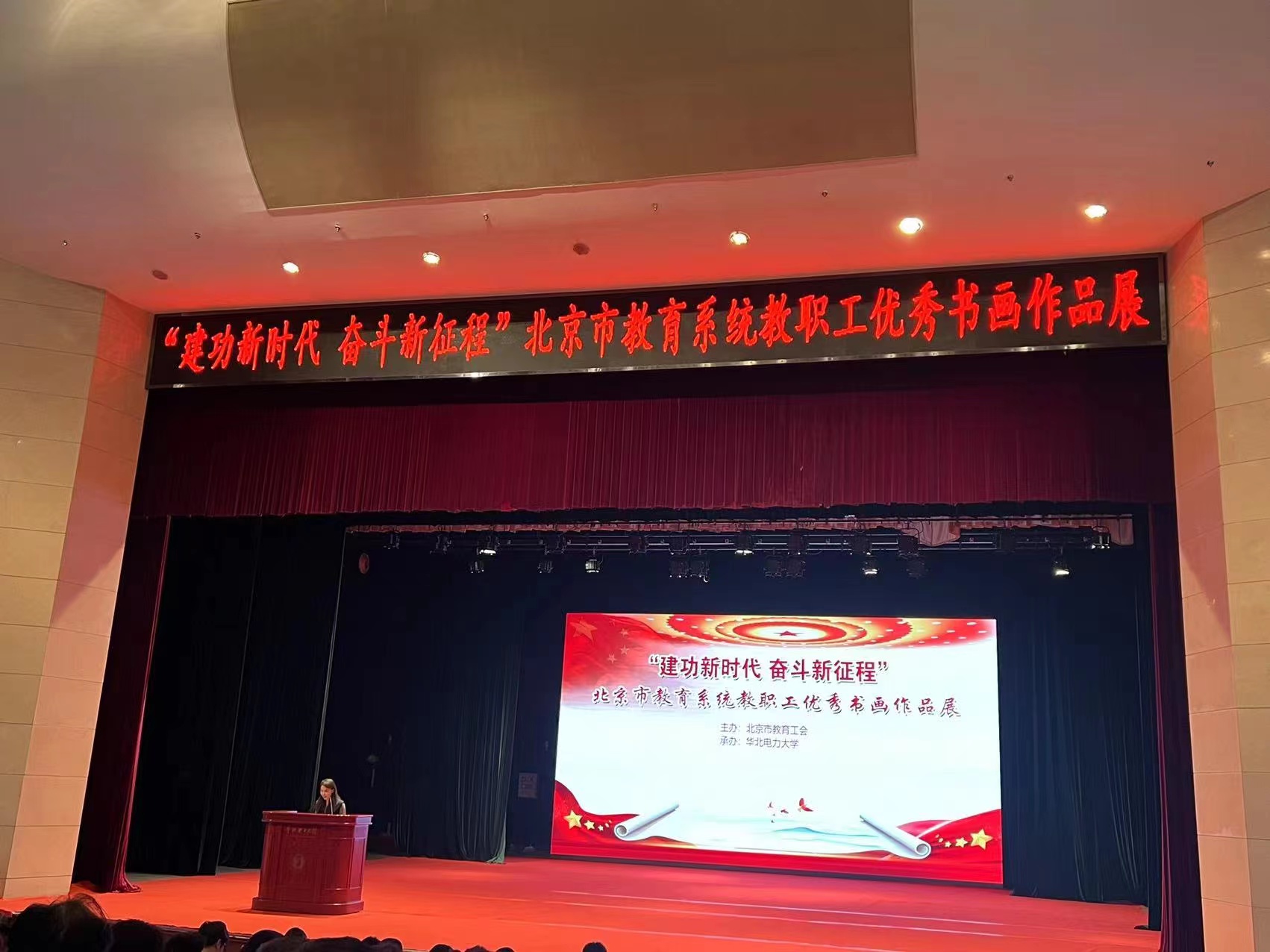 为贯彻落实党的二十大精神,学习贯彻习近平新时代中国特色社会主义思想,弘扬中华优秀传统文化,提升教职工队伍的综合素质,4月18日,北京市教育系统教职工优秀书画作品展开幕式在华北电力大学举办。北京语言大学艺术学院教师魏晓妍受邀参加开幕式,并作为获奖代表发言。
