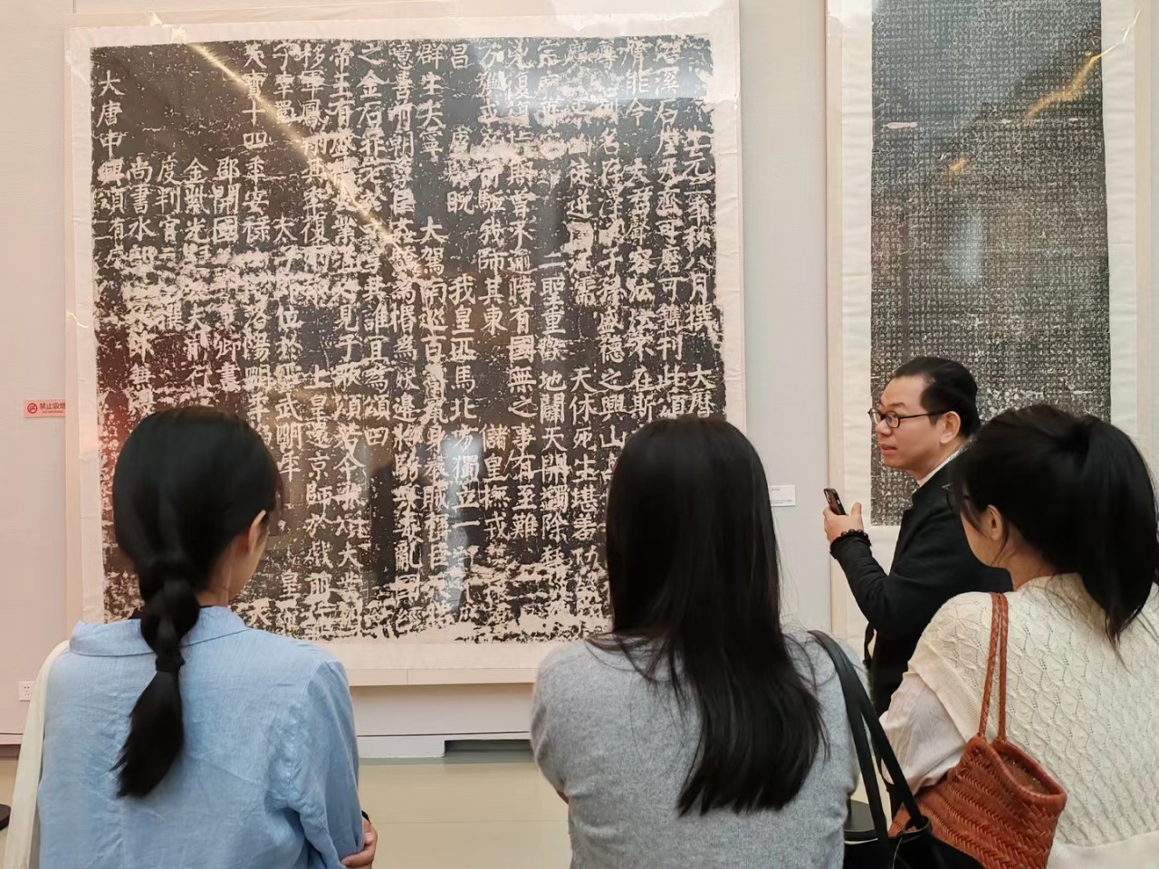 步入展厅,我们驻足在气势恢宏的《大唐中兴颂》前,梁老师为同学们讲述了这件作品的历史背景并分析相关艺术特征:作为颜真卿书法成熟时期的一件代表作,全篇布局紧密,真力弥满,充实朴茂,有金戈铁马的恢宏之气。梁老师强调:“我们在临习过程中需要把握作品的整体气势,在拓本的残破之处,要学会舍弃因风化等因素所带来的糟粕之处,同时学会根据全碑的笔法特点补全残破之处。