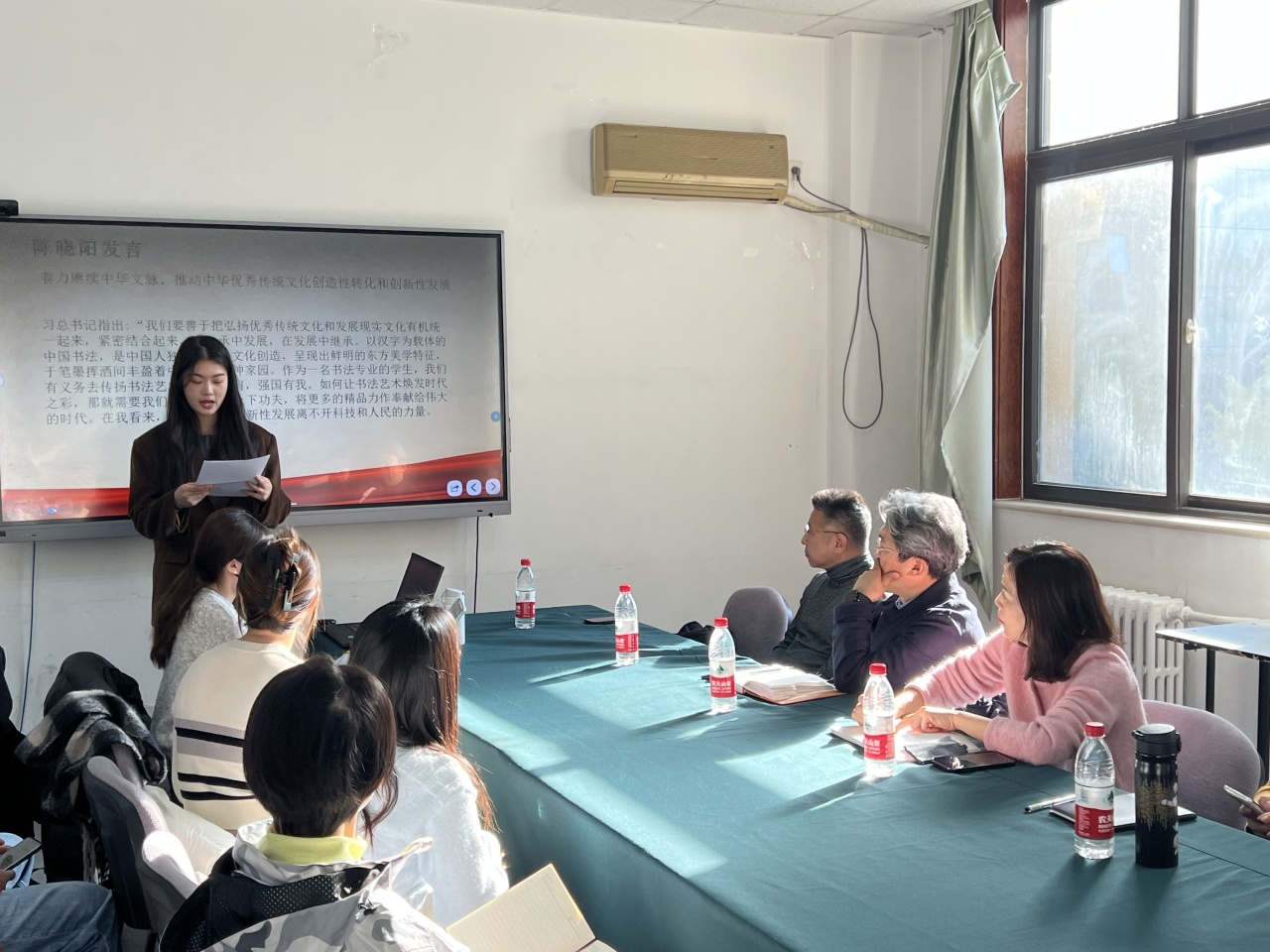 陈晓阳同学就“着力赓续中华文脉、推动中华优秀传统文化创造性转化和创新性发展”这一主题展开发言,她认为,书法艺术的创新离不开科技和人民的力量。在文艺作品的创作中,要深入人民群众,以互联网思维因应视觉时代。作为未来的文艺工作者,我们要以只争朝夕、不负韶华的学习劲头,带着问题意识深入研究书法艺术,努力成为融技术性、艺术性、文艺性相统一的书法工作者,让书法艺术焕发时代之彩。