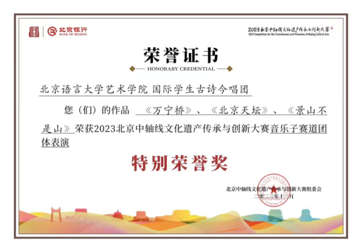 北京语言大学艺术学院国际学生古诗今唱团获“特别荣誉奖”