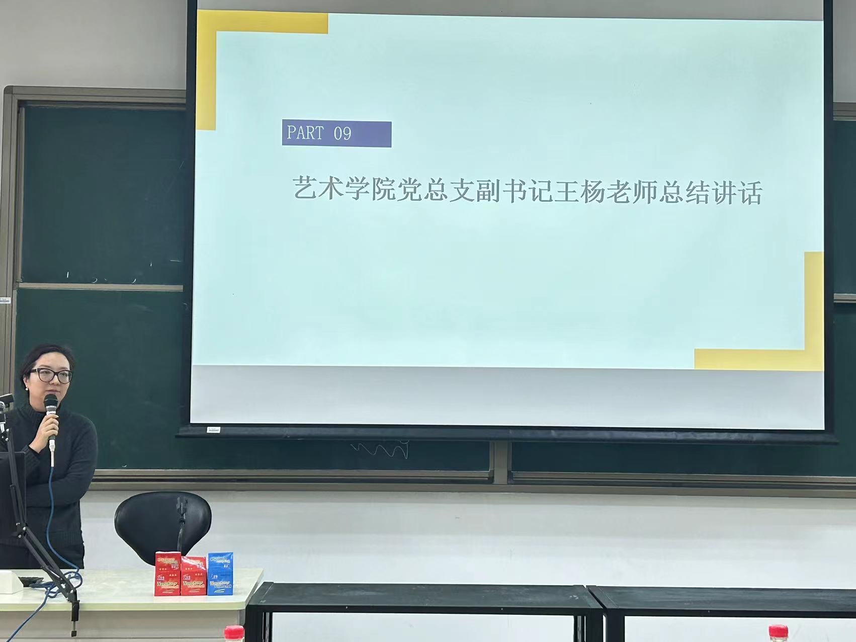 最后,艺术学院党总支副书记王杨老师表达了新学期对学生干部们和班主任们的期望,希望各组织齐心协力、开拓创新,高质量高效率地做好学生工作,展现新时代学生工作的新作为。她提出了对学生的两点希望:一是希望同学们自觉形成自我管理意识,在平时的学习中积极作为、把握青春年华,不负期望,做一个有目标而为之奋斗的人;二是希望同学们主动高效完成各项工作,培养良好的心理素质和健全的人格,营造良好的学习氛围,树立良好学风,创作出更多更优秀的作品。