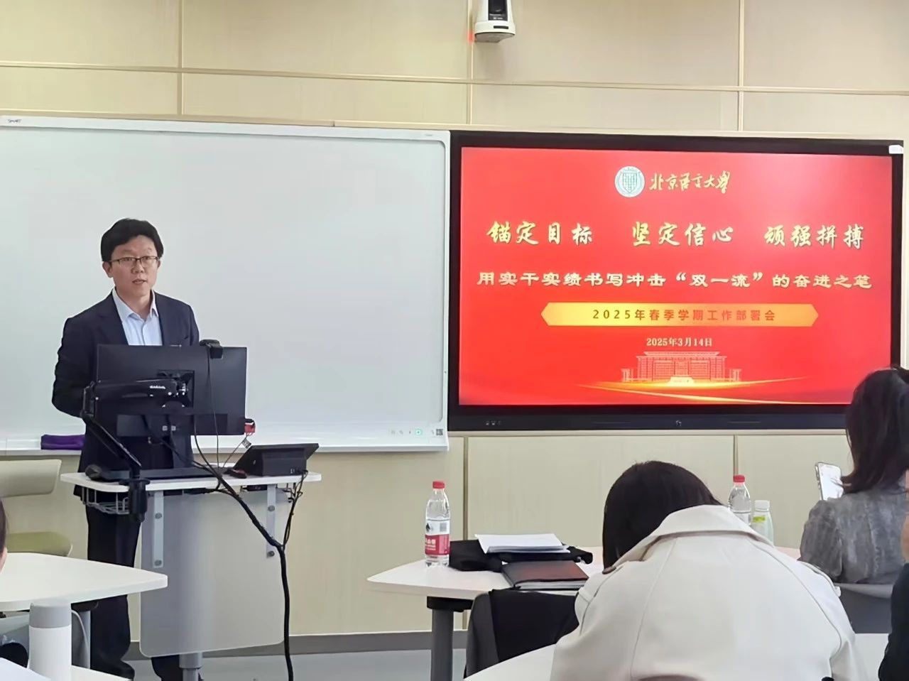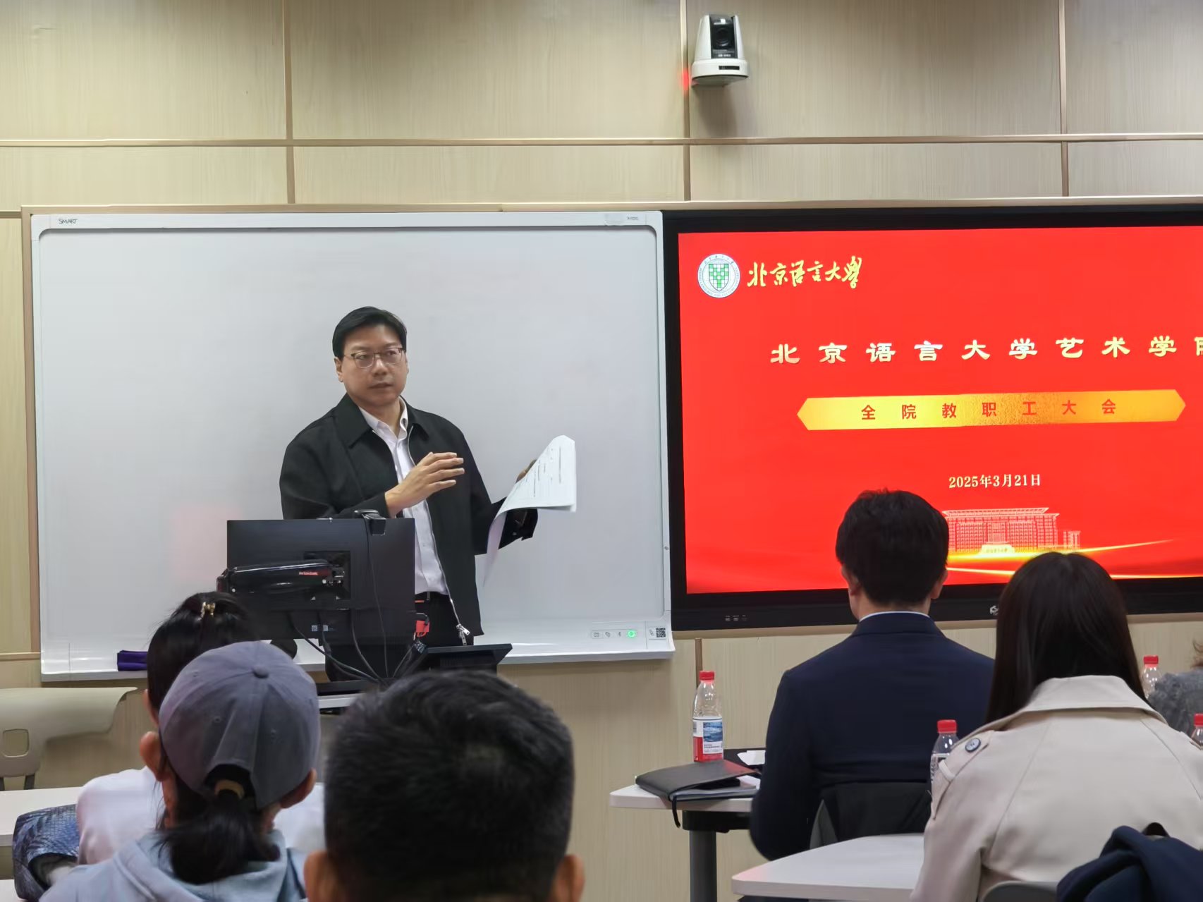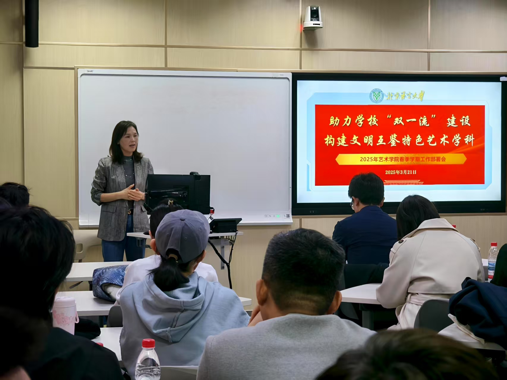 张雯强副书记首先传达了倪海东书记和段鹏校长在全校2025年春季学期工作部署上的重要讲话精神。倪海东书记强调,2025年是“十四五”发展的收官之年和“十五五”发展的开局之年,也是学校冲击双一流的关键之年,各项工作都要“强基固本,提质增效”。段鹏校长回顾了过去一年学校取得的可喜成绩,号召全体教师锚点目标、坚定信心、顽强拼搏,用实干实绩书写冲击“双一流”的奋进之笔。张雯强副书记强调,为了助力学校冲击“双一流”建设,艺术学院将用高质量的党建推进学院事业高质量发展,将着力塑强“艺心向党”党建品牌,以“四大工程”构建“一四一二”党建工作体系。