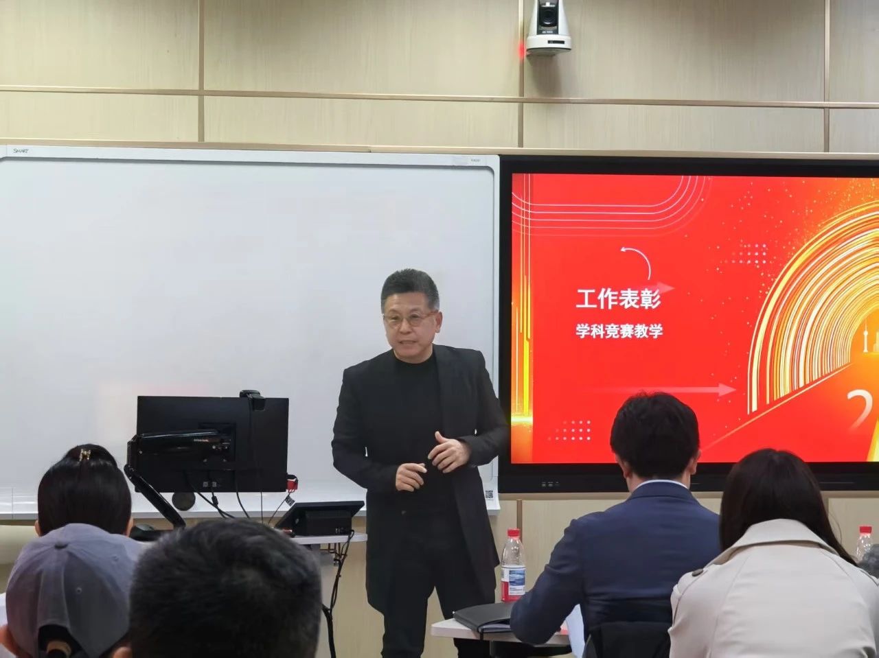 史大鹏副书记主持了表彰环节。2024年度,学院魏晓妍、姚紫津、王宁三位老师获得学院就业工作突出贡献奖,朱启宁老师指导学生获得2023-2024学年学科竞赛国家级特等奖,张侠老师指导学生获得2023-2024学年学科竞赛国家级奖项,梁文斌、金珂宇、董卿三位老师指导学生获得2023-2024学年学科竞赛省部级奖项。陈霞院长和张雯强副书记为以上获奖老师颁发荣誉证书。