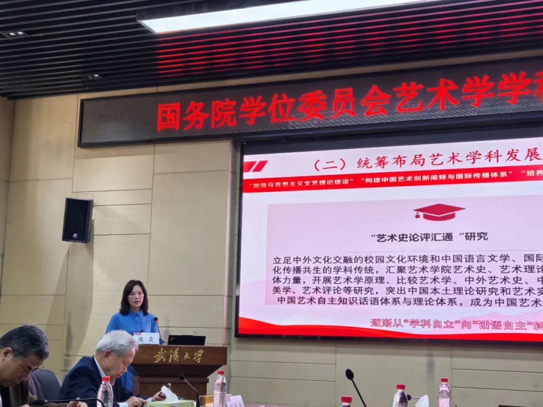 在新学科目录颁布后学科建设经验交流环节,武汉大学等5个交流单位从自身体量、发展和培养体系等现实情况出发开展了汇报分享。武汉大学艺术学院院长孟君介绍了武汉大学艺术学学科的发轫源流及学科特色,上海大学上海美术学院执行院长金江波就学院的发展思路和建设成效分享了经验,武汉理工大学喻仲文重点介绍了全球视野下的艺术交流史研究这一特色方向,山西大学梁晓萍展示了智库建设与资政研究成果,西北师范大学史忠平阐述了未来申报培养方向的调整规划。