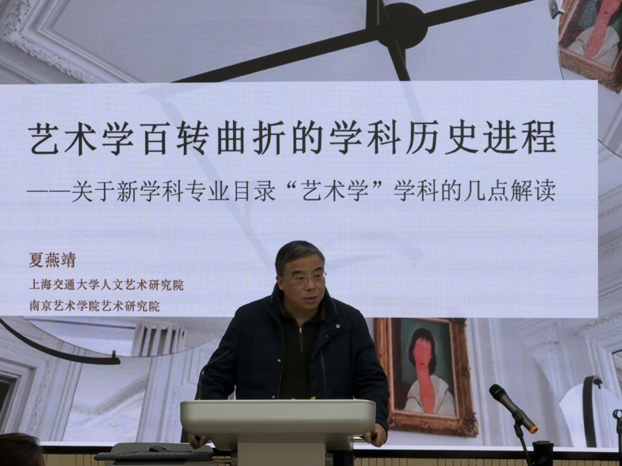 讲座开始,夏燕靖教授以新版学科专业目录的调整为切入点,指出自2022年9月新版学科专业目录颁布后,艺术学学科在原有艺术学理论学科基础上的改革与建设。为满足服务国家重大发展战略的需要,新版学科专业目录遵循学科发展和人才培养规律的新要求,做出了学科内部之间、学科与学科之间的重新整合,重新规划了艺术学学科群的方向。这意味着新版学科专业目录的推出,具有引导学科未来发展的指南作用。为此我们有必要慎重对待、充分认识,深入探讨和预估新的艺术学学科发展趋势。
