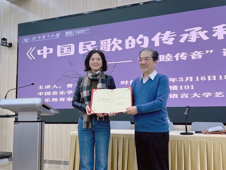 北京语言大学艺术学院党总支书记陈霞对讲座进行了概括总结,并向曹文工教授颁发聘书。《中国民歌的传承和弘扬》“敦睦传音”讲学计划系列在同学们热烈的掌声中结束。本次讲座为同学们拓展了视野,激发同学们对中国民歌传承和发扬意识,增强同学们的民族文化自信心。讲座结束后全体师生对此反响热烈,并衷心的期待曹文工教授的再次莅临。
