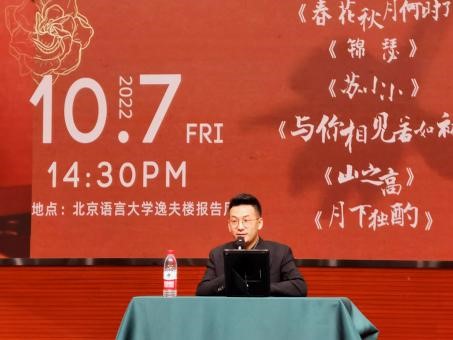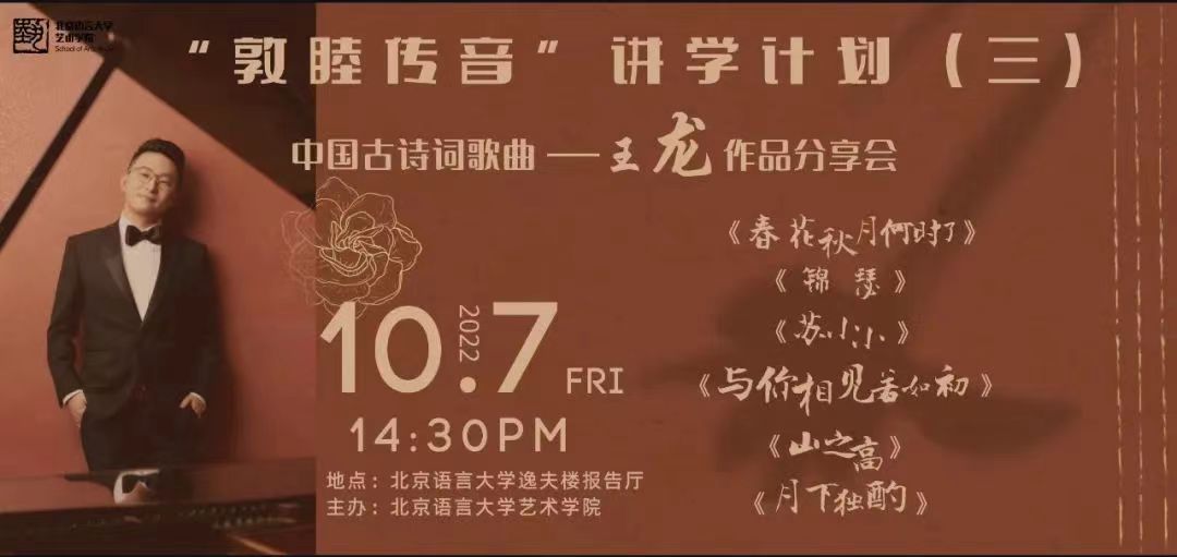 2022年10月07日下午2:30,中国音乐学院王龙老师受北京语言大学艺术学院之邀,莅临北语主讲的“中国古诗词歌曲——王龙作品分享会”在逸夫报告厅顺利开展。这也是北语艺术学院主办的“敦睦传音”讲学计划系列讲座第三讲。